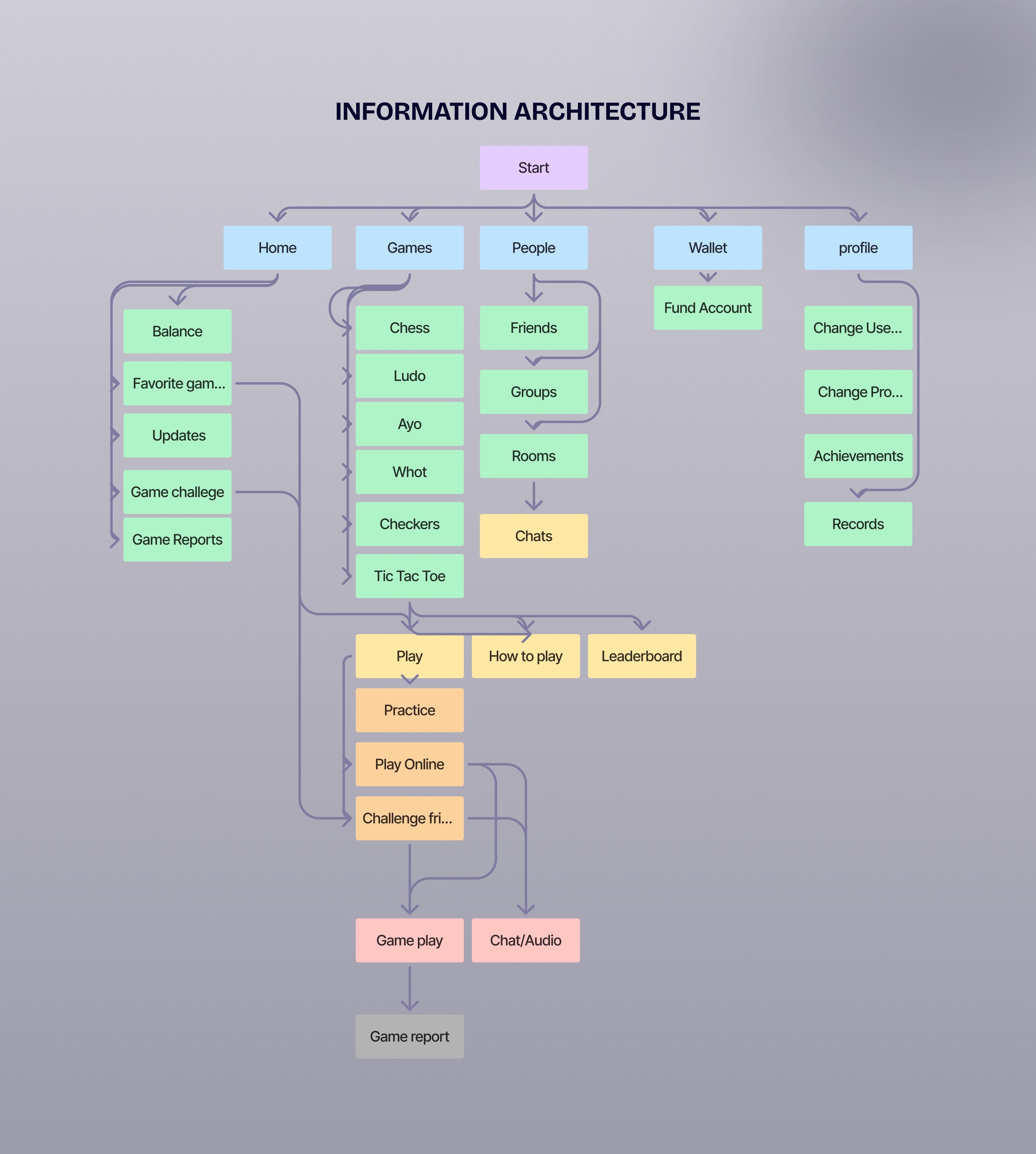 To achieve the set goals, I conducted extensive research on the target users and similar platforms. By analyzing their structures, engagement models, and user feedback, I gained insights into what makes a gaming experience both competitive and enjoyable. I then developed detailed user flows and information architecture to map out the user journey, ensuring smooth navigation and intuitive interactions. This groundwork allowed me to create a design that prioritizes accessibility, fairness, and engagement—making it easy for players to compete, connect with others, and earn rewards effortlessly.